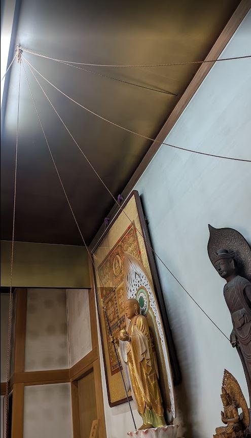実はこの紐、本堂のたくさんの仏様や仏具などに繋がっており、それが一つにまとめられて天井裏、そして最終的に、お寺の屋根にそびえる「宝珠」に繋がっているのです。