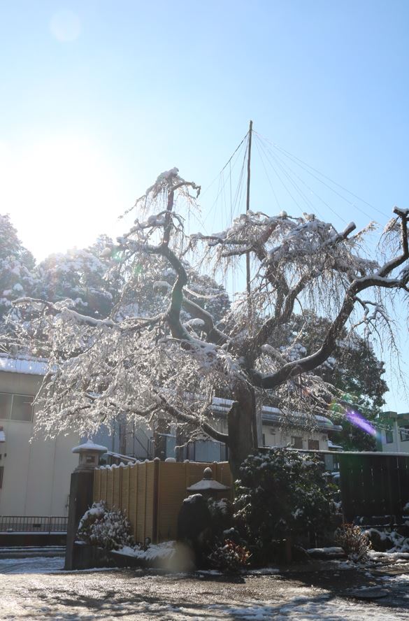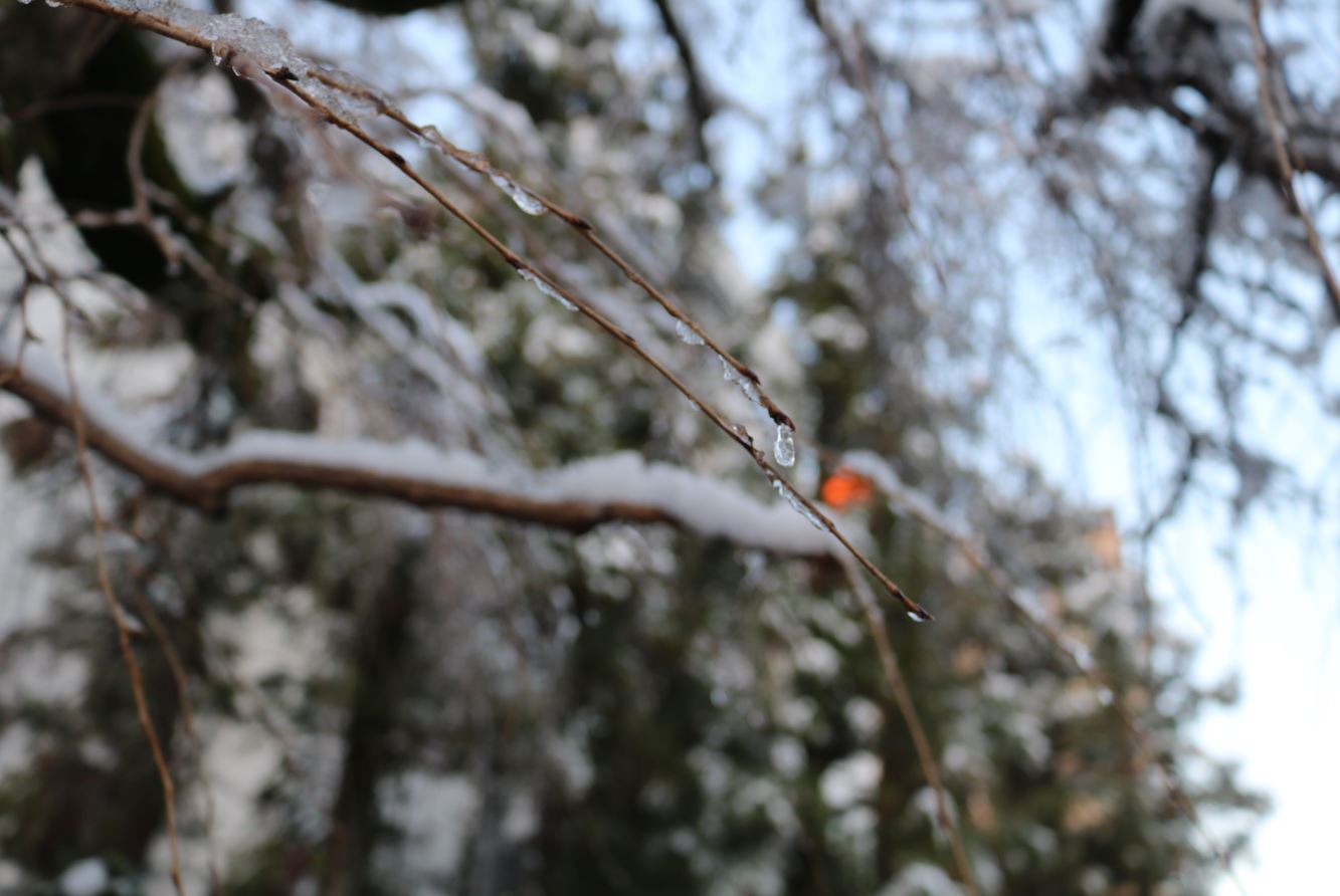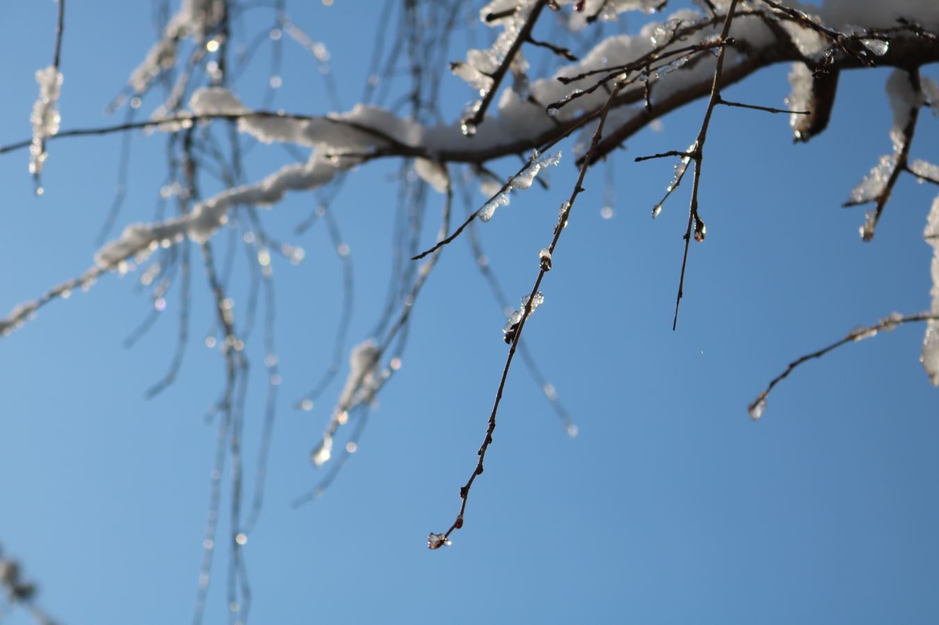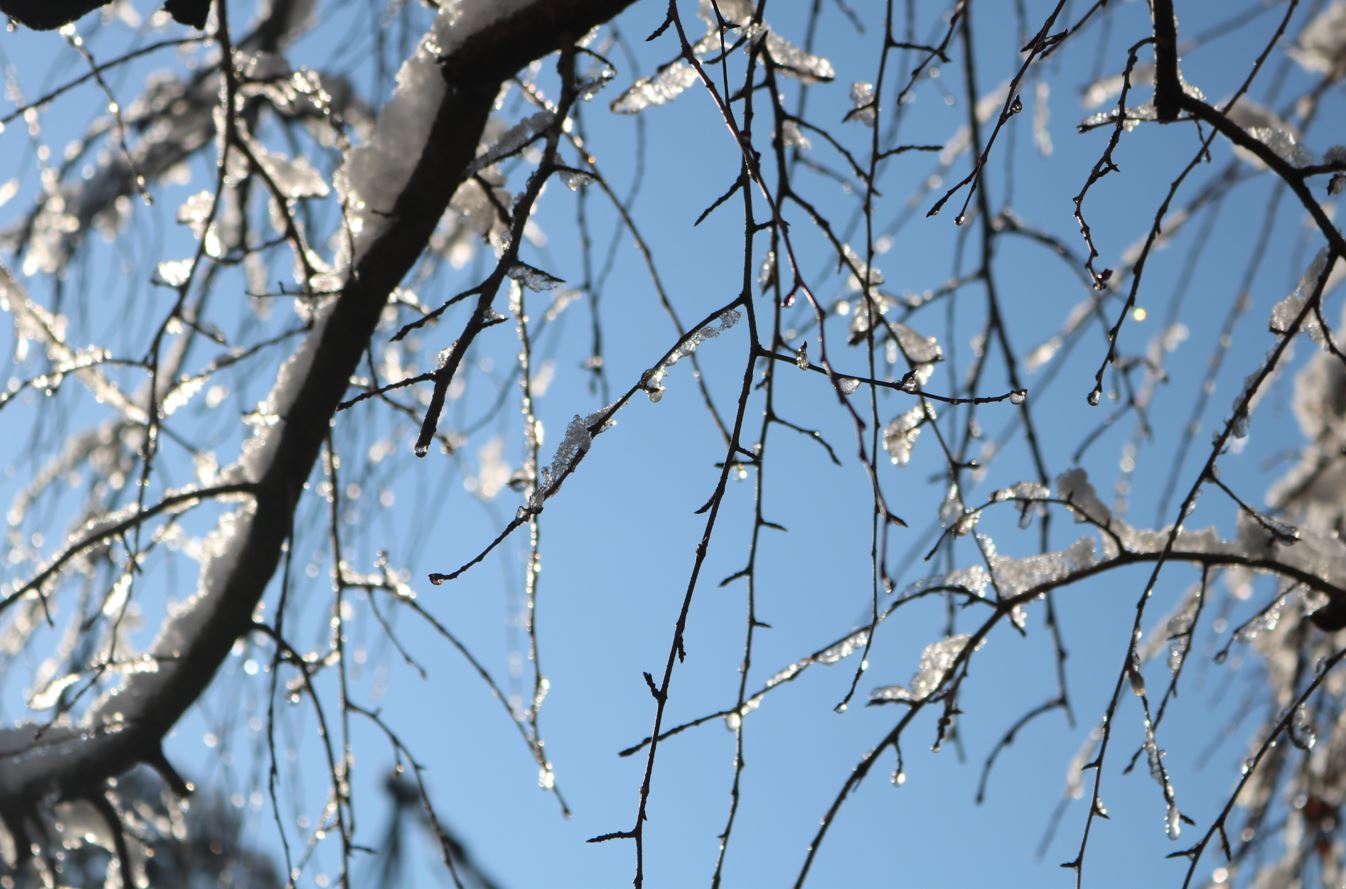 溶けかかって、再度凍結したのか、桜の枝には雫の氷が、まるで蕾のように枝にぶら下がり、